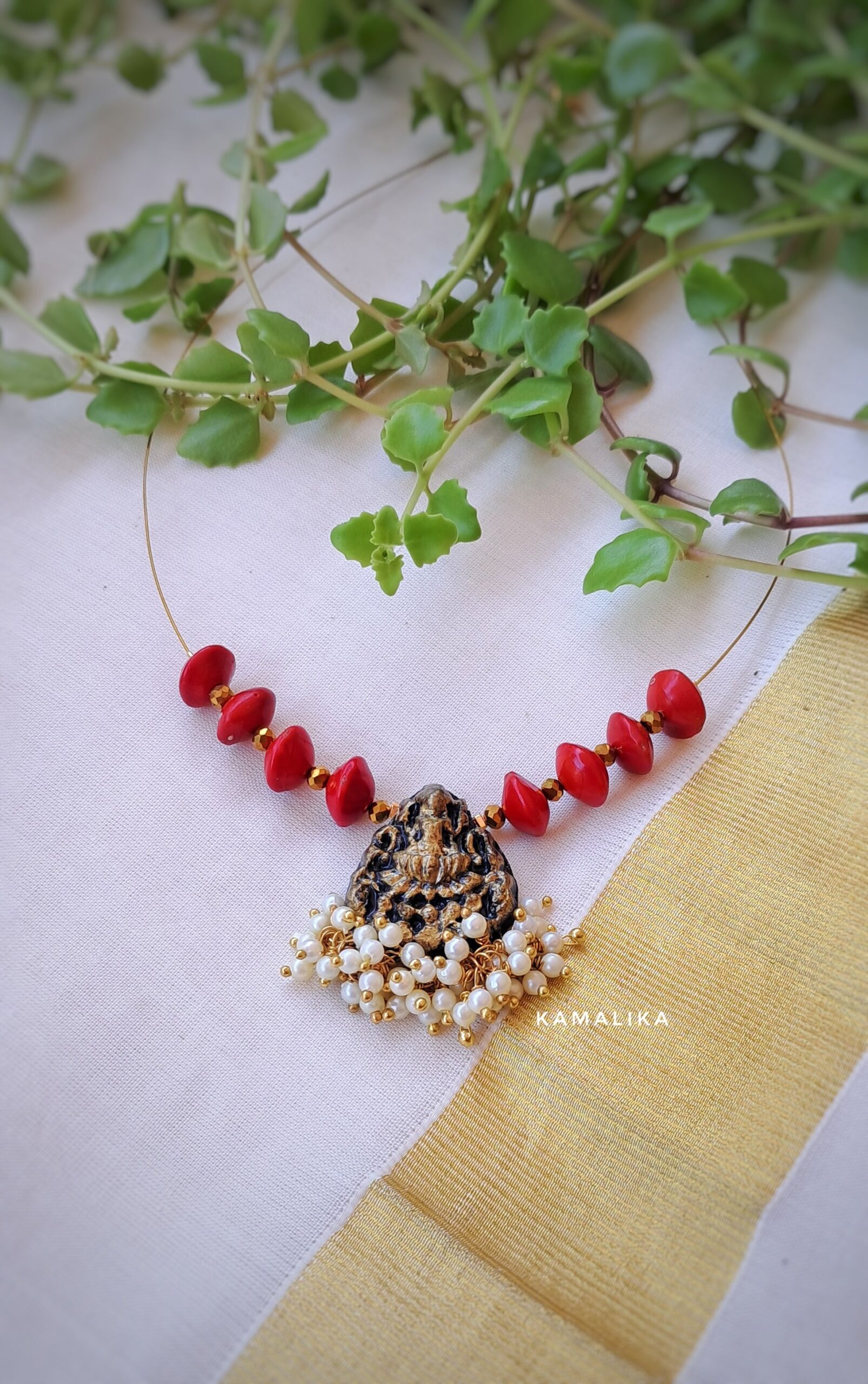 This Manjaadi jewelry piece is crafted using the sacred red seed known as **Manjadi kuru**, a symbol of love, protection, and nostalgia in Kerala culture.